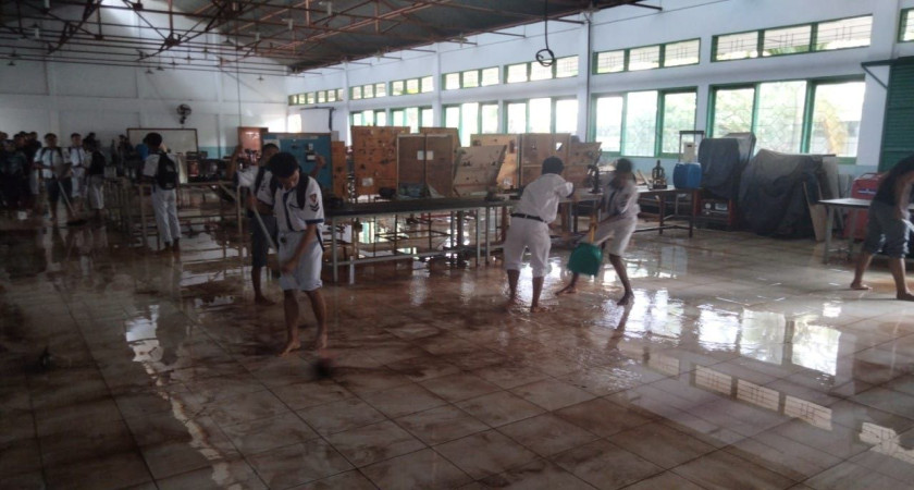 Membersihkan ruang bengkel akibat hujan di bengkel Otomotis